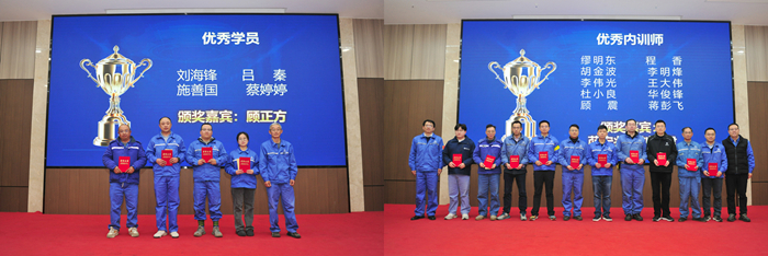在結(jié)業(yè)儀式上,4名優(yōu)秀學(xué)員代表分別結(jié)合自身參與的《揚子江造船解決方案》(YSS 2.0)、電子化廠圖等課題,分享了數(shù)字化轉(zhuǎn)型實踐中的經(jīng)驗與感悟。2025年集團(tuán)內(nèi)訓(xùn)師全年授課量達(dá)732課時,培訓(xùn)人次超2.5萬,其中安環(huán)條線人均授課17課時,生產(chǎn)條線人均14課時,展現(xiàn)了內(nèi)訓(xùn)師團(tuán)隊的強大賦能能力?,F(xiàn)場表彰了4名“智改數(shù)轉(zhuǎn)專項優(yōu)秀學(xué)員”和10名“優(yōu)秀內(nèi)訓(xùn)師”,公司領(lǐng)導(dǎo)為獲獎?wù)哳C發(fā)證書及獎金。