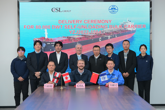 12月18日,船東代表Andrew Lennox先生、我集團(tuán)副總經(jīng)理兼揚(yáng)子三井總經(jīng)理宋書明先生及揚(yáng)子三井CFO石丸雄次先生共同簽署“CSL KANATA”輪交船文件。祝愿新船航行平安、滿載順達(dá)、一帆風(fēng)順!